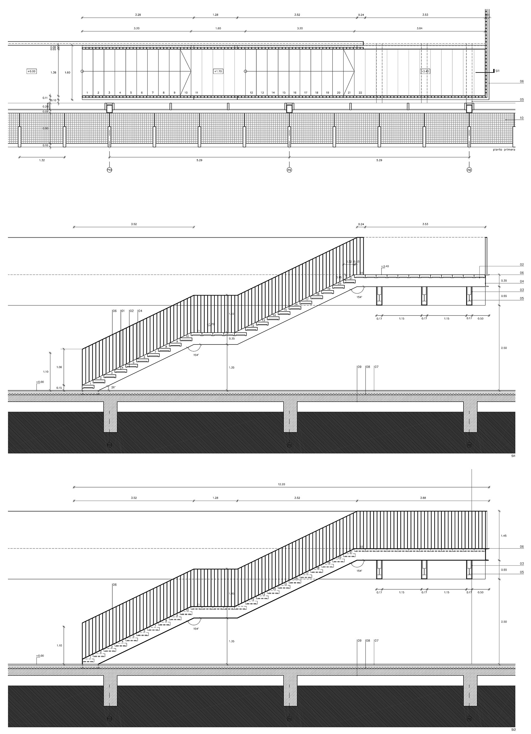 La escalera se sitúa en una posición más elevada respecto el forjado en previsión de la cota del pavimento final. La estructura de la escalera está formada por 2 UPN 350 laterales y pletinas horizontales para los escalones de 15mm de espesor.