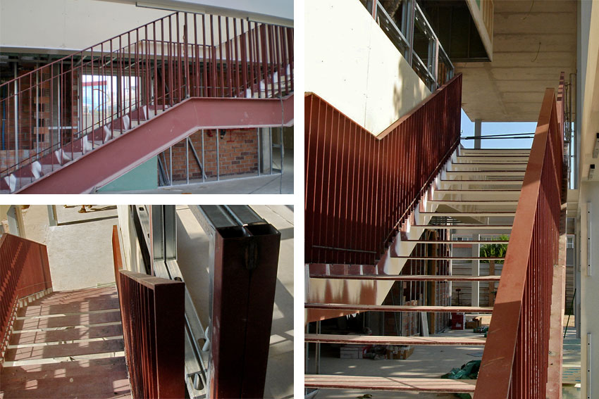 La barandilla está realizada mediante pletinas de 40mm de anchura y 10mm de espesor separadas 100mm entre ellas. Está fabricada en un único tramo en taller y soldada en obra a la estructura lateral de la escalera, pletina a pletina. Para mantener la distancia de separación hay una barra provisional soldada en la parte inferior que luego hay que retirar.
