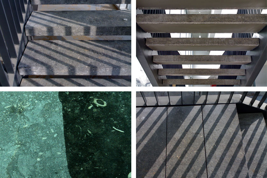 Los peldaños son de una pieza de piedra caliza de medidas 150x32x7cm con un rehundido en la parte central inferior para que encaje la pletina de 15mm de la estructura metálica donde queda fijado el escalón con resina epoxi.