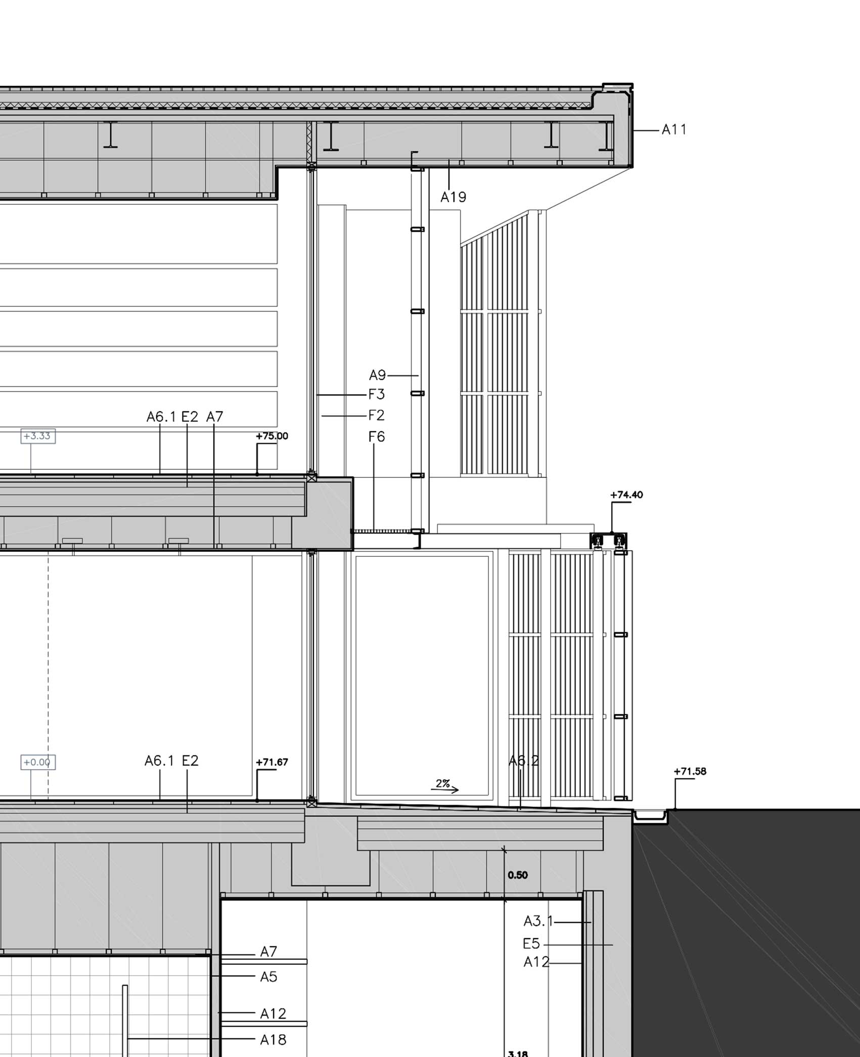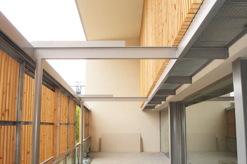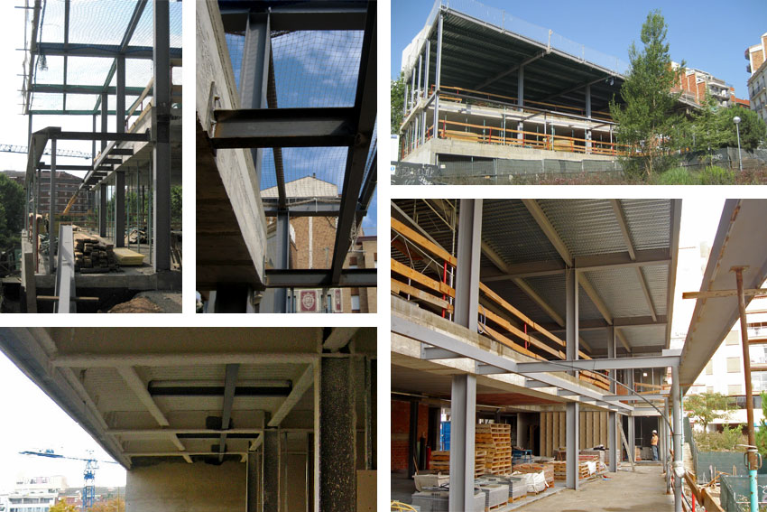 Pilares de fachada de acero y cubierta se realizada con un forjado colaborante. La estructura metálica se protege al fuego con perlita vermiculita proyectada.