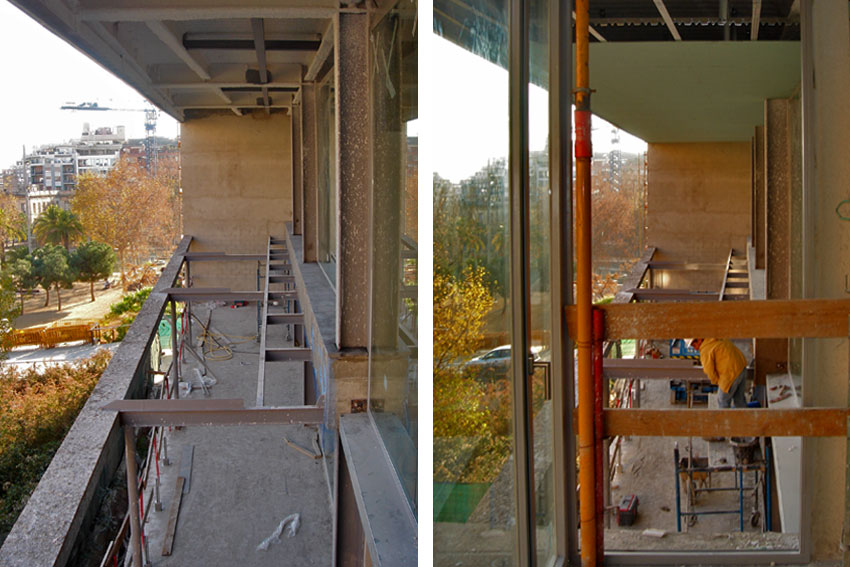 Colocación de las carpinterías fijadas a estructura de cubierta mediante tirantes y flejes, de tal forma que no afecte a la previsión de los falsos techos. En el pavimento en cambio, las carpinterías de aluminio se fijan directamente sobre el pavimento interior de terratzo.