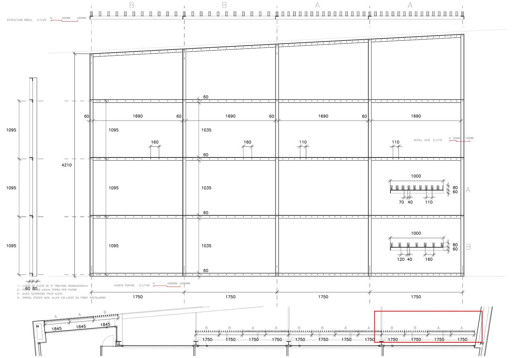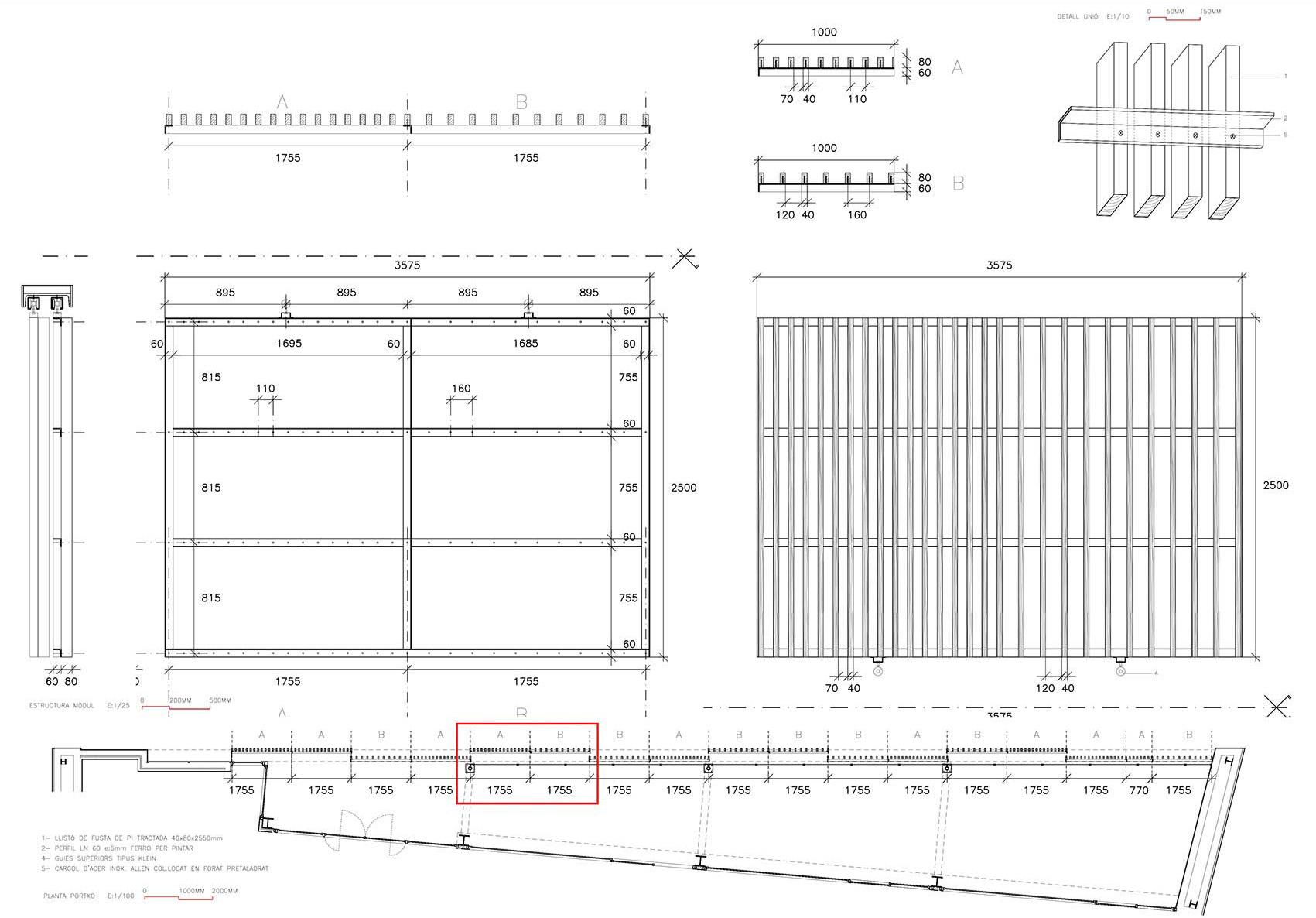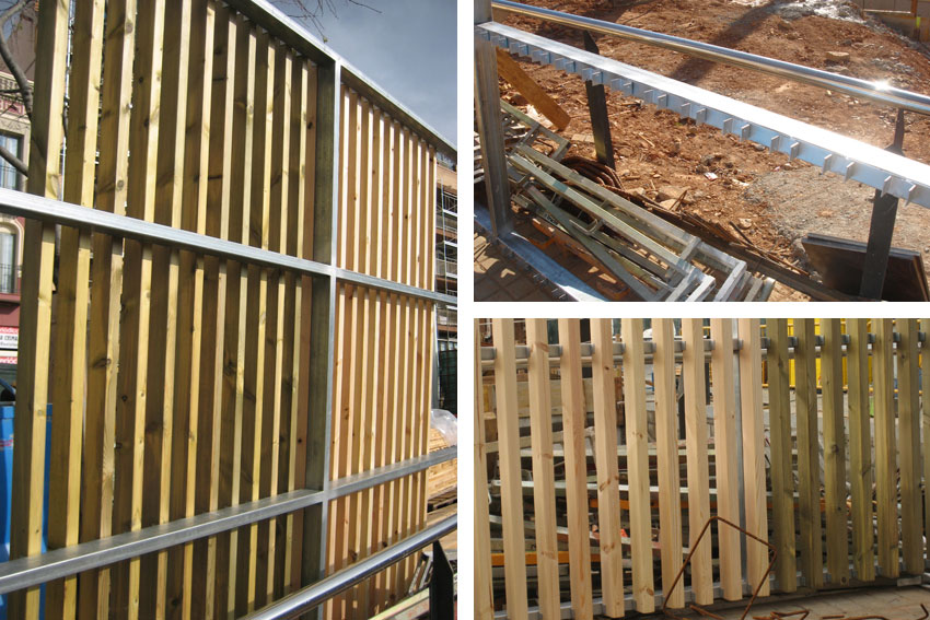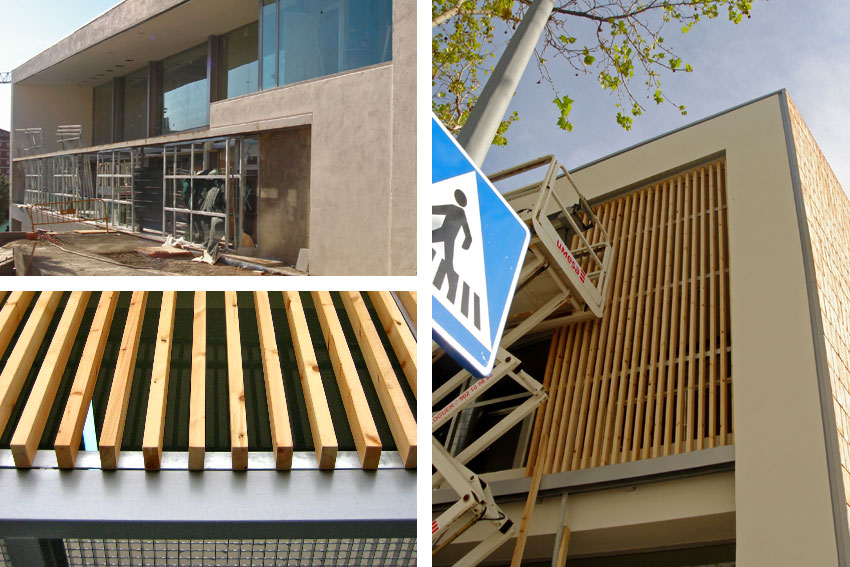 Prototipo de los módulos de lamas de madera. Se realiza una estructura tubular de acero galvanizado en caliente que luego irá fijada a la estructura principal del edificio. Estos módulos tienen pestañas donde las lamas que se fijaran mediante tornillos específicos para madera. Los listones de madera que forman las lamas son de pino tratado al autoclave. En la imagen se puede observar distintas pruebas del tratamiento de la madera; autoclave (la más verdosa) o con aceites naturales (la más clara).
