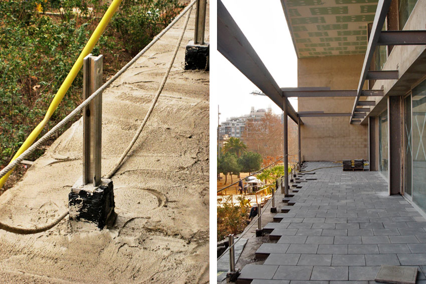 Colocación de los paneles móviles en las guías motorizadas. Estos módulos son móviles para poder cerrar el casal fuera del horario público. Cuando están abiertos se agrupan en un extremo de la terraza permitiendo abrir vistas del interior del edificio al parque. La barandilla de la terraza también es transparente para poder mantener estas vistas, y está formada por vidrio laminado 6+6 y un pasamanos ancho que permite apoyarse. Este pasamanos está realizado en chapa plegada de acero inoxidable de 2mm de espesor.