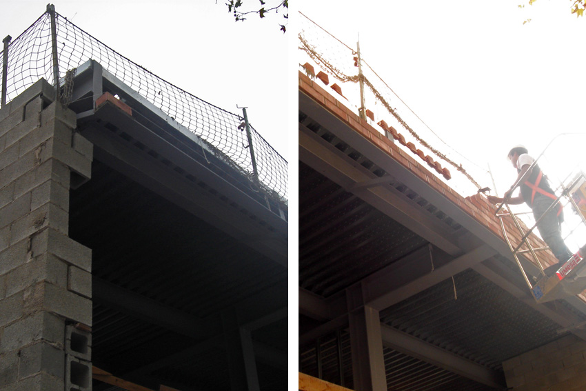 04Recrecido de los cantos laterales de la cubierta para que tenga el mismo grosor que el de las paredes laterales de los testeros. Este recrecido se realiza descolgando una estructura metálica que sirve de sustentación de la pared cerámica de tape que dará el grosor final a la cubierta.