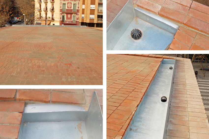 00La cubierta está subdividida en grandes pastillas delimitadas con juntas elásticas. Esta previsión de juntas evita que las piezas salte o se rompan, favorece los movimientos de dilatación y retracción de la cubierta.