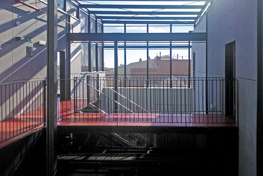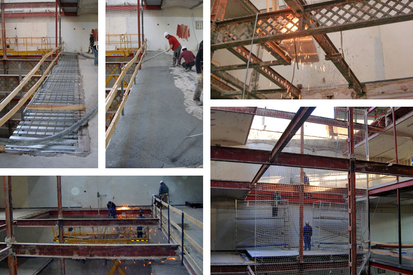 Se recrece parte de los forjados para adecuarse a las necesidades del proyecto. Este recrecido se realiza con un forjado colaborante; forjado mixto realizado con chapa grecada y hormigón armado.