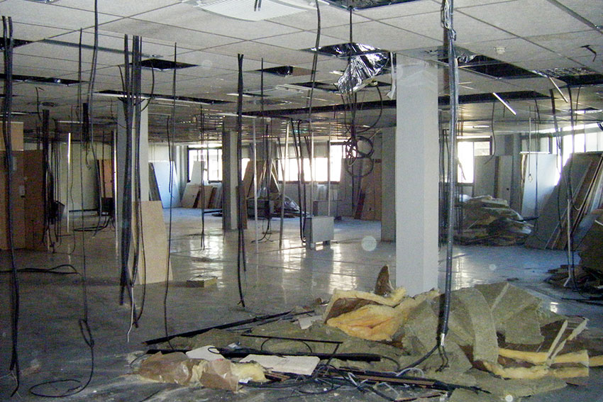 Estado inicial de la reconversión de las oficinas. Plantas diáfanas, techos registrables con perfileria vista, pilares forrados, pavimentos deteriorados, etc.