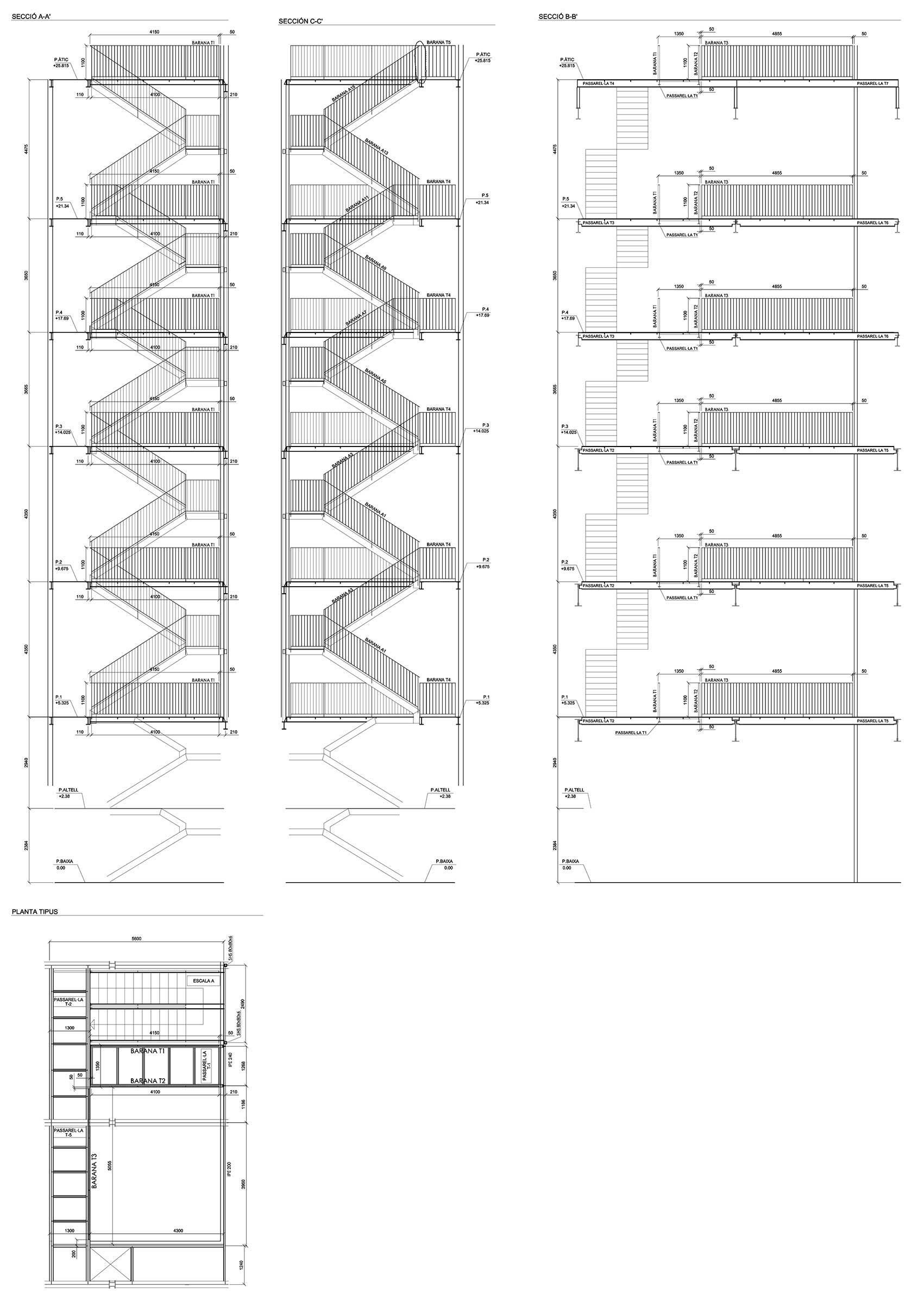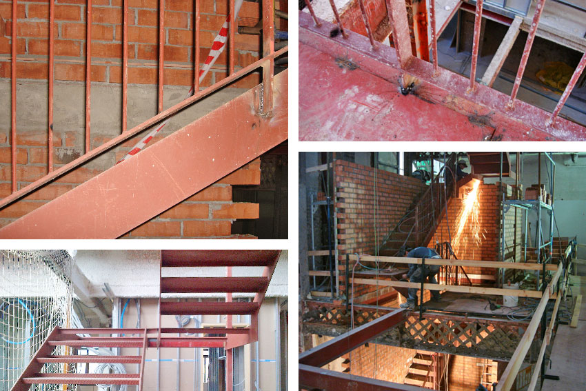 Los tramos de la escalera se van soldando uno a uno al entramado de conforman las nuevas jácenas y las jácenas existentes. El peldañeado de la escalera también es metálico y está realizado mediante chapa plegada con acabado antideslizante tipo lágrima o cacahuete.