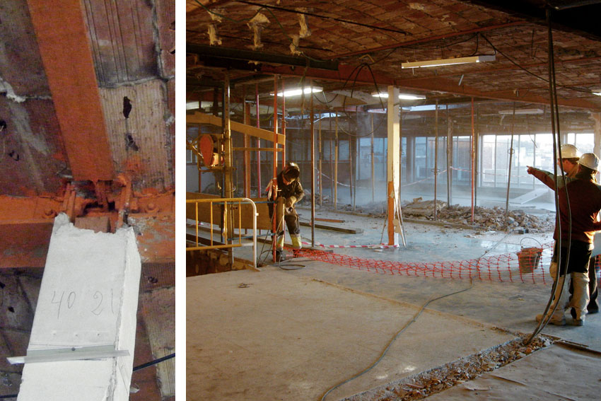 Apuntalar y reforzar la estructura existente. Especialmente los forjados para garantizar su estabilidad. Se empieza por abrir manualmente los forjados para realizar el hueco de la escalera.