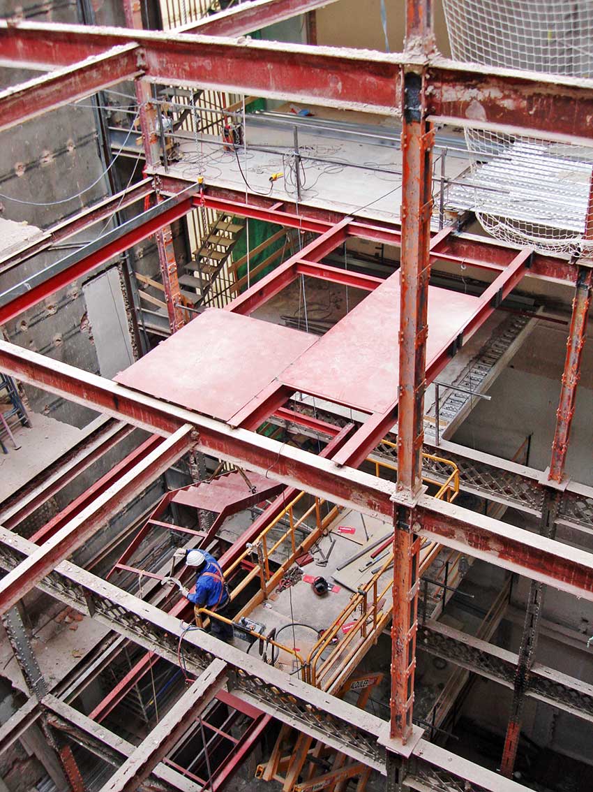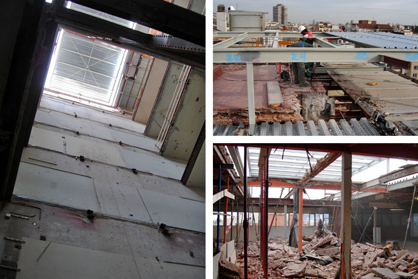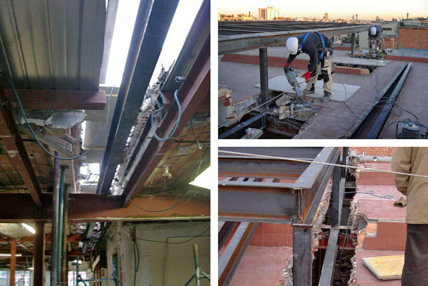 Retirada y derribo de techos, instalaciones y suelos. Descubrir los forjados y la estructura metálica; pilares y jácenas.
