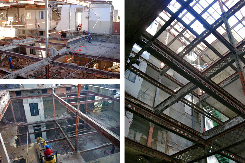 Derribo con medios mecánicos del hueco del patio y el núcleo de la escalera. Se mantiene el entramado estructural de pilares y jácenas para incorporarlo al diseño final de la escalera.