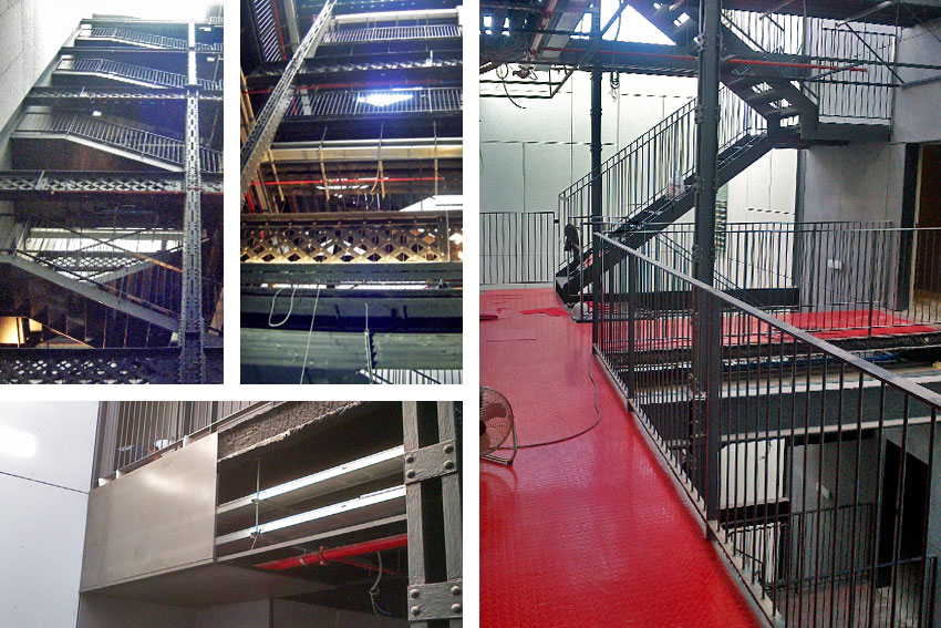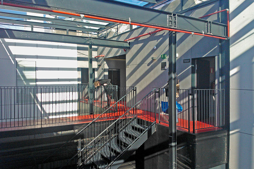 Por la cara inferior de las pasarelas están las instalaciones, estas quedan ocultas por cajones registrables. La dimensión de estos cajones está asociada al grosor de las jácenas existentes. Por la parte superior, las pasarelas está acabadas con un pavimento industrial adherido antideslizante en color rojo como contrapunto al acabado general del conjunto en color negro de la escalera, las barandillas y la estructura.
