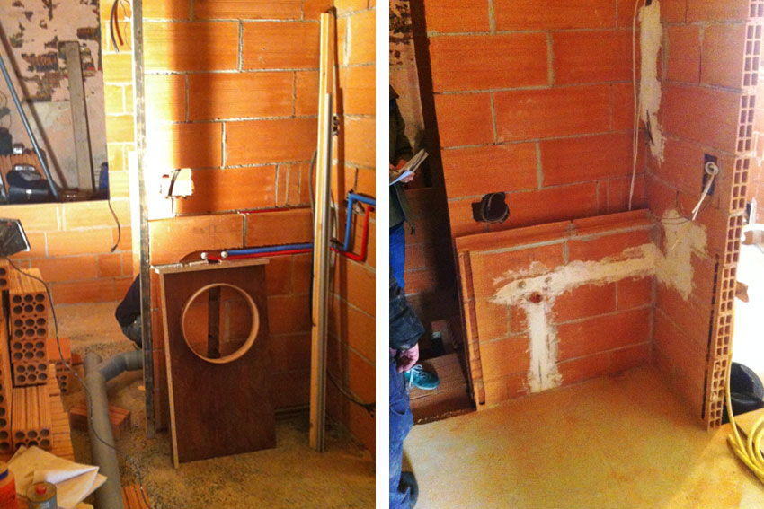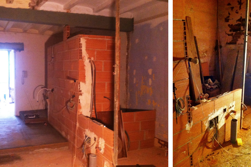 En las paredes de ladrillo hueco cerámico de gran formato se realizan las regatas de paso de las instalaciones de agua y electricidad para cada una de las piezas que compondrán el baño y la cocina.