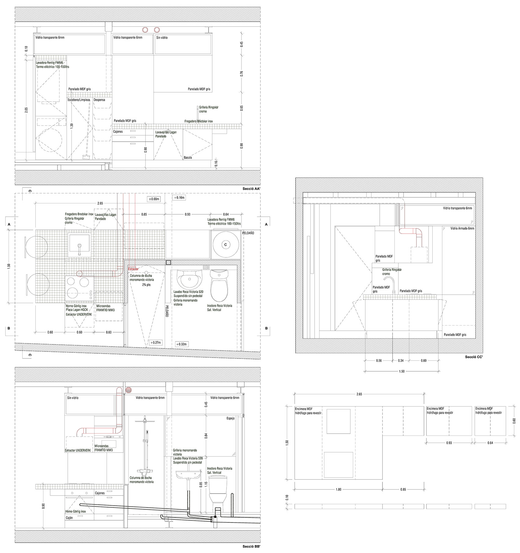 Planta, sección y alzados de detalle.