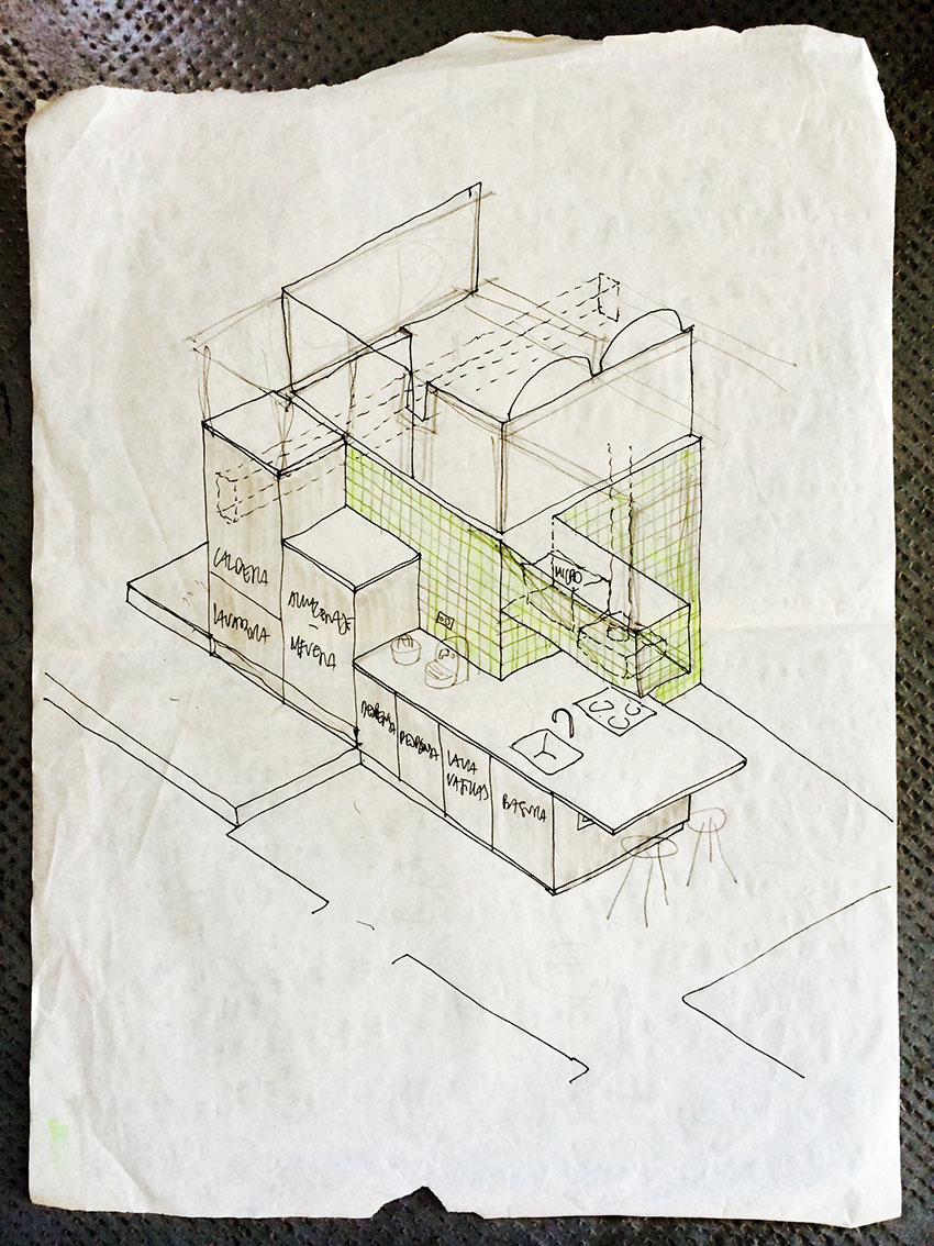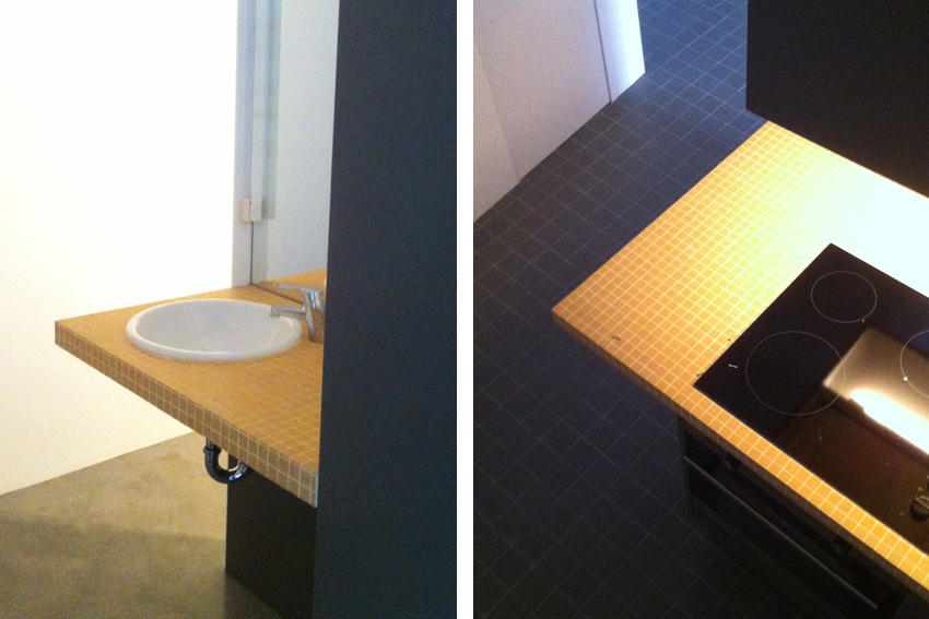Los muebles y armarios de almacenaje están acabados en panelado MDF gris oscuro, en cambio la encimera de la cocina y las repisas están acabadas con un revestimiento gresite amarillo.
