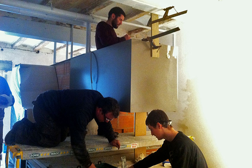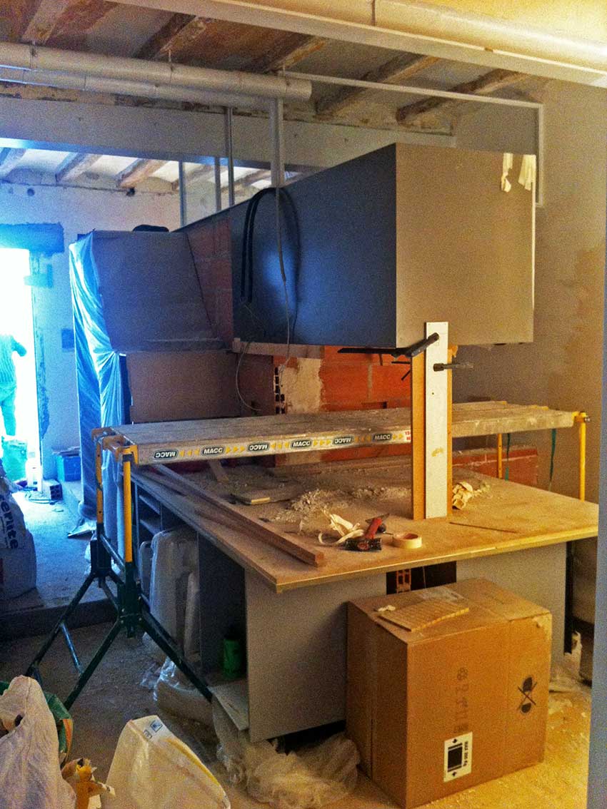 En la parte superior del volumen se montan los marcos de las carpinterías y se instalan los conductos de extracción del baño y el conducto de humos de la campana extractora de la cocina.
