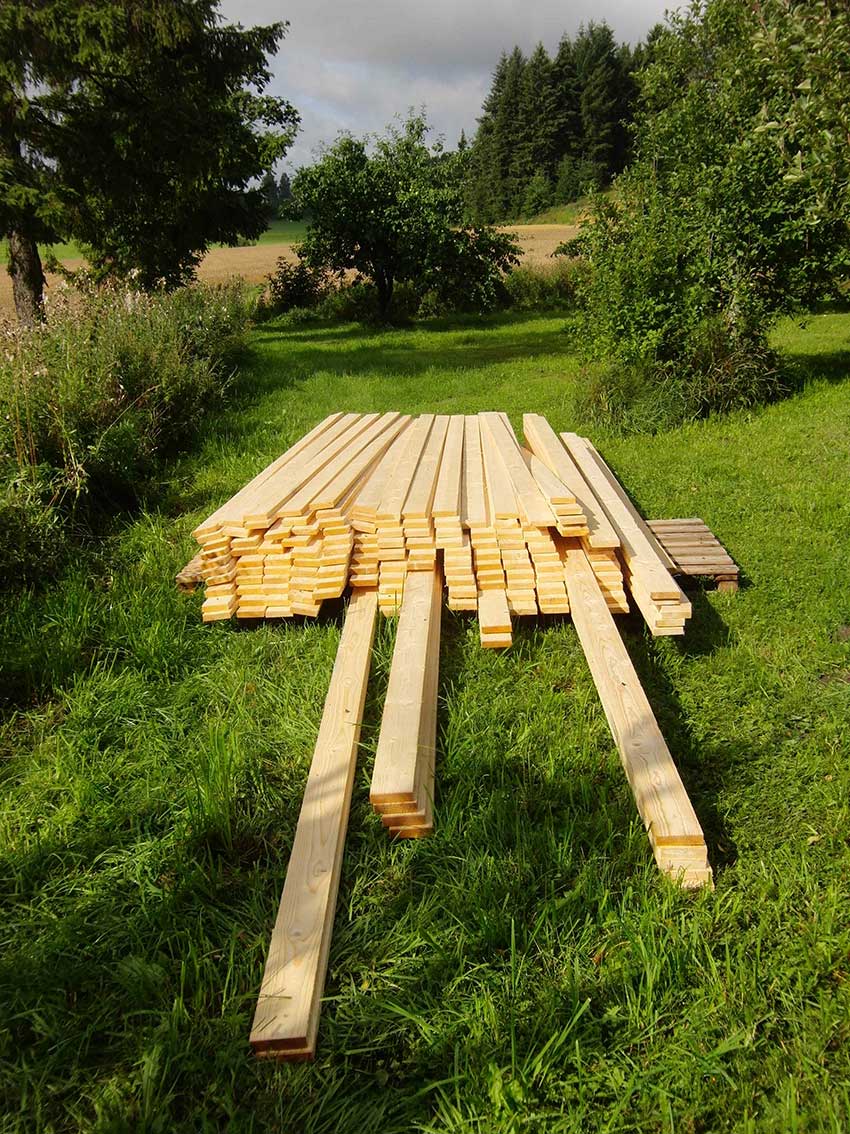 Para la estructura y los suelos se utilizó madera de abeto de la propia granja, de árboles plantados en los bosques de ésta por el bisabuelo de los niños, y cortados por su abuelo. El resto de la madera se compró en la ferretería del pueblo, madera de pequeñas serrerías de la zona.