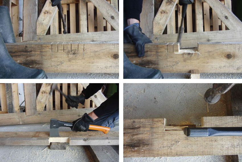 Detalle unión estructural. Proceso de ejecución de un encaste en un pilar para su posterior unión con una viga transversal. Replanteo y validación de las dimensiones de la estructura con los clientes y posterior montaje.
