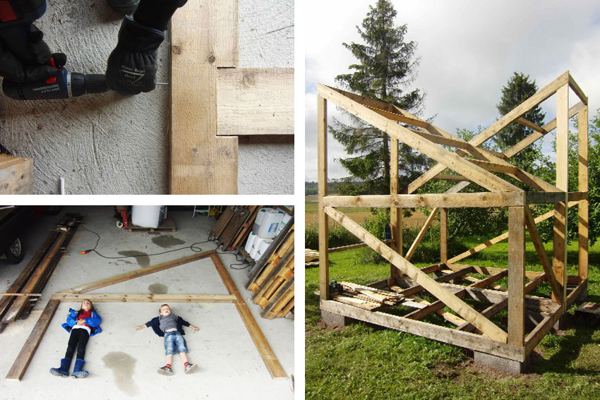 La construcción de la casita duró dos semanas. Se hizo completamente de manera autónoma entre dos personas (nosotros mismos, más dos pequeños ayudantes), y fue un proceso tan gratificante como educativo: los niños vieron y entendieron que las cosas se consiguen con esfuerzo, y que uno mismo puede fabricarse sus propios sueños.