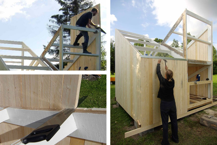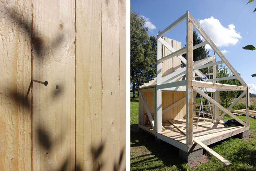 Toda la casa está hecha de madera; estructura, suelos, paredes y cubierta, utilizando sistemas tradicionales de construcción de graneros tales como dejar la distancia de un clavo entre listones para que la casa ventile.