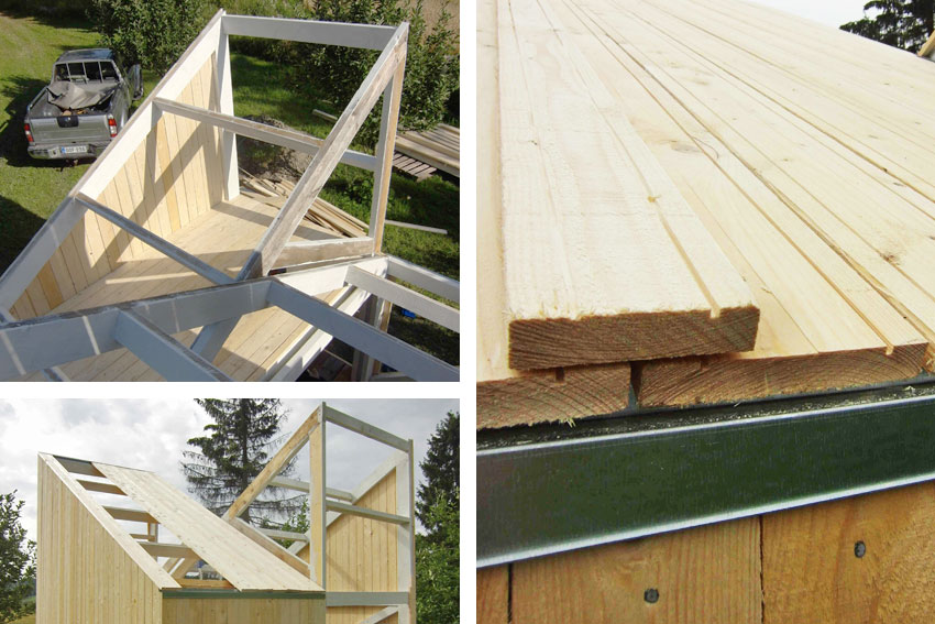 Un sistema de cubierta hecha a partir de una simple supersposición de tablones de madera ranurada para evitar la entrada de agua. Sólo unos pequeños vierteaguas de chapa galvanizada ayudan a sacar el agua y proteger los cortes de la madera de fachada.